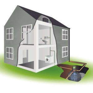 The indirect supply system is designed to support WCs, washing machines, irrigation, and outside cleaning purposes. Rainwater is collected from the roof of the property and fed into the underground tank via the downpipes. On entry to the tank, the water passes through a filter to prevent any debris from going into the tank. With this system, there is a pressure-sensitive pump located in the underground tank. When a valve or tap is opened, water will be pumped under pressure until the valve is closed, allowing the system to repressurise turning the power off to the pump. From the header tank, the water is gravity-fed to the WC’s, etc.